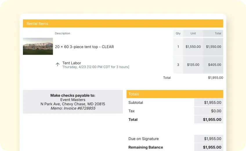 This year, you don’t have to run it off spreadsheets, mental math, and sticky notes. See what it feels like to run your tent rental business on real software — from $39/month.